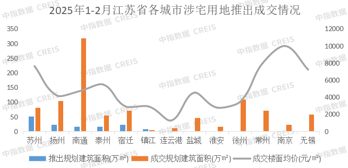 2025年1-2月,江苏省共推出涉宅用地31宗,推出规划建面137.86万平,共成交涉宅用地136宗,成交规划建面达971.27万平,全省成交楼面均价为5085元/㎡。其中,2月涉宅用地推出9宗,推出规划建面34.65万平,成交33宗,成交规划建面达219.75万平,全省楼面均价为5327元/㎡。