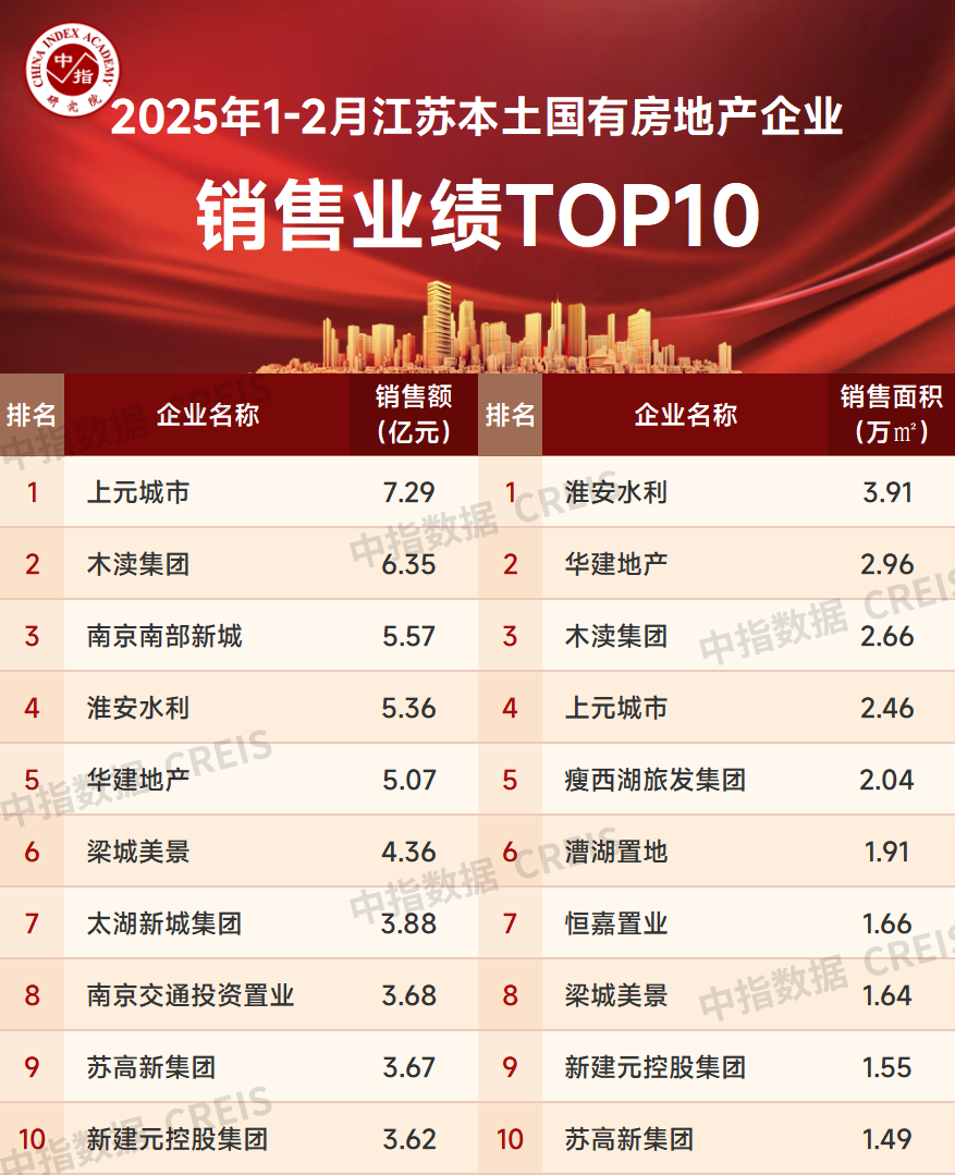 说明:房地产企业销售数据统计是以2025年1月1日-2月28日期间销售的商品住宅为统计口径,主要依据在江苏省的销售监测数据,并参考当期总体经营情况和推盘去化情况进行分析统计;对于少数没有在监测范围内的项目,由企业提供相关证明文件,经课题组对数据进行严格审核,也纳入统计范围。本报告仅供参考,课题组不对使用报告及其内容所引发的任何直接或间接损失承担责任。