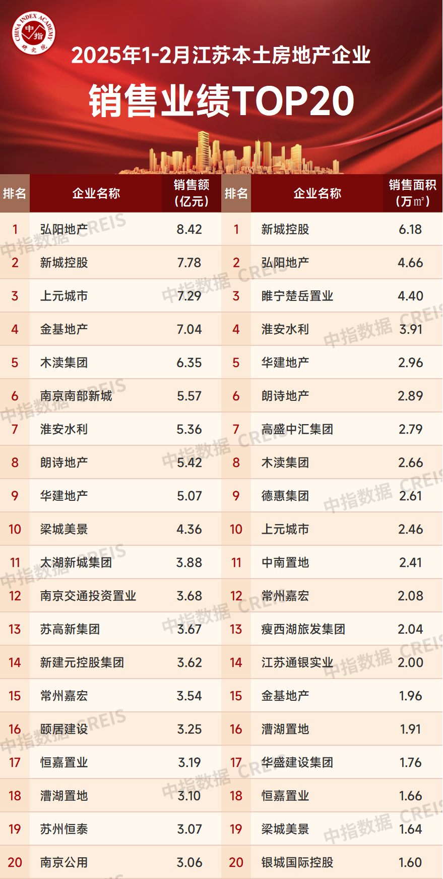 2025年1-2月,江苏省本土房企TOP20门槛值为3.06亿元、1.60万平。其中,弘阳地产以8.42亿元位居销售金额榜榜首,新城控股以6.18万平夺得销售面积榜首位,TOP3本土房企销售业绩均超7亿元、4万方。